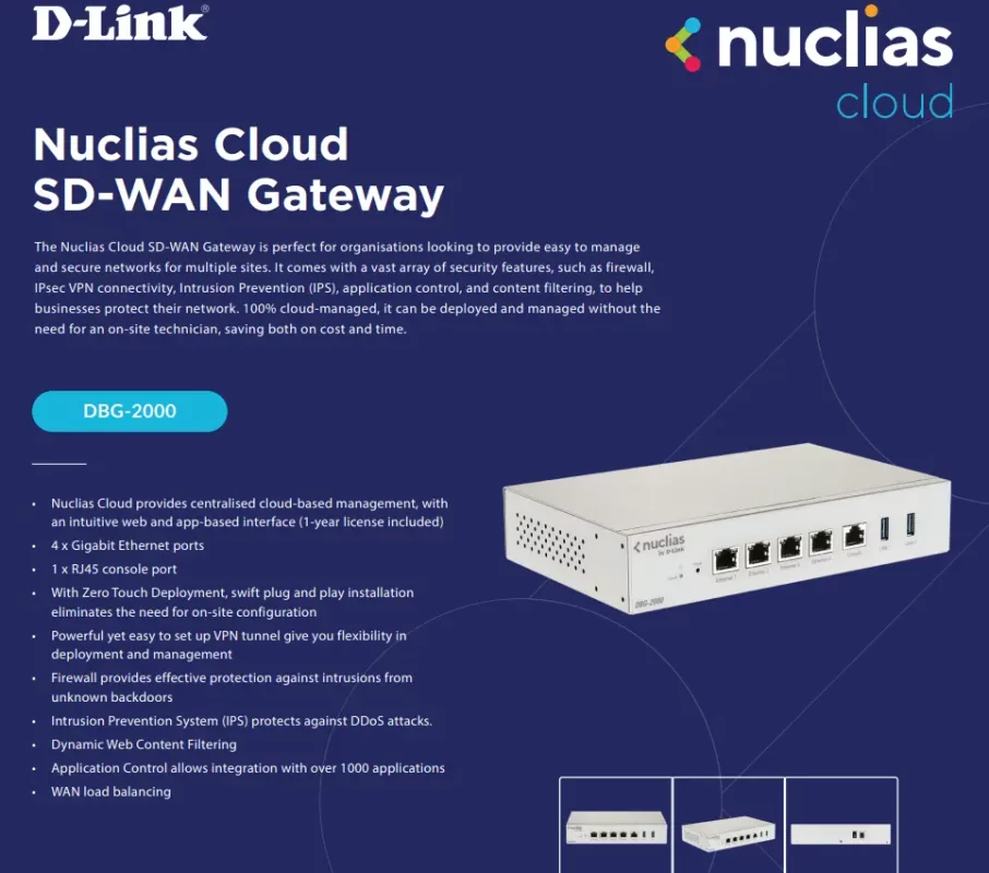 Imaginez un seul appareil qui fait office de passerelle VPN, de pare-feu, de filtre de contenu, tout en optimisant vos connexions Internet grâce au SD-WAN. Avec Nuclias Cloud, vous pilotez tout depuis le dashboard : suppression des complexités, gain de temps, moins de déplacements et plus de contrôle.