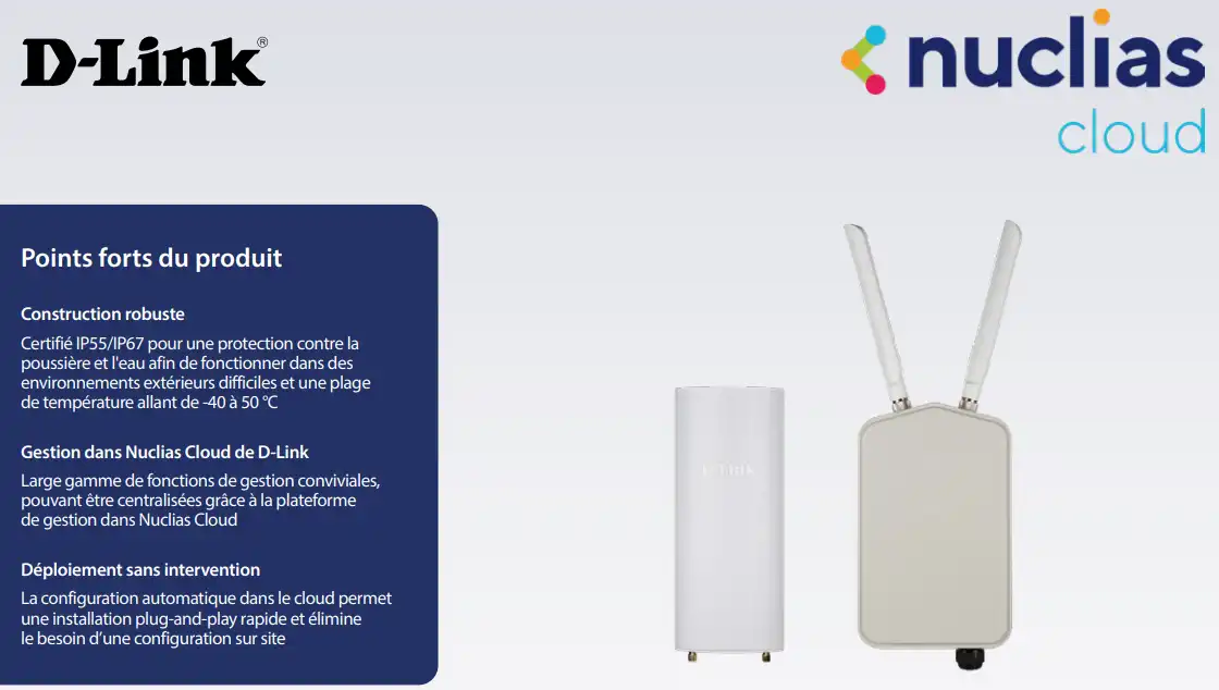 Gestion cloud via Nuclias Cloud, licence incluse pour 1 an; supervision, statistiques en temps réel, portail captif, alertes, mise à jour firmware à distance. |
